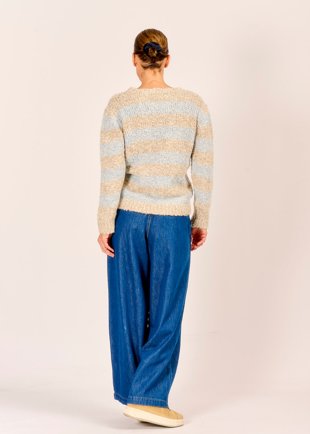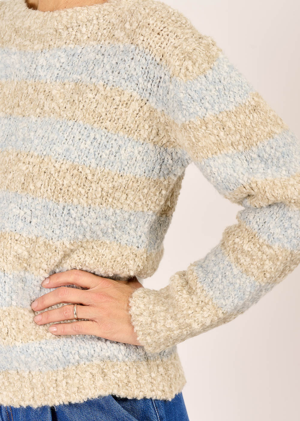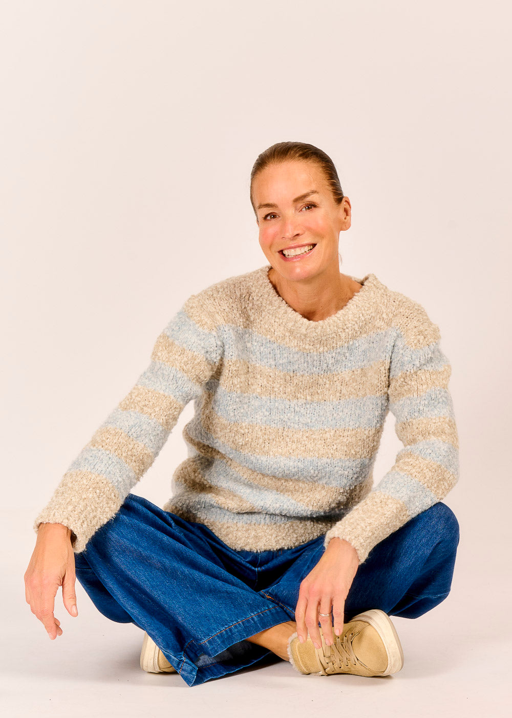 Dieser hellblau-beige gestreifte Strickpullover verleiht deinem Look Leichtigkeit und sanfte Eleganz zugleich. Mit seinem zeitlosen Streifendesign wird er zum perfekten Stylingpartner für lässige Freizeitlooks.